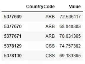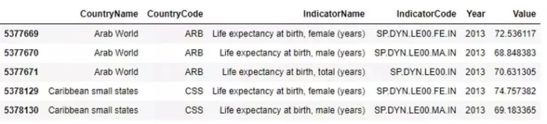 我们获得以下内容。似乎不同国家的指标集中有不同的指标,还包含了指标的年份和值。