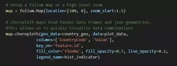 我们还需要指定相关参数。'key on'参数代表json对象中的标记,该标记将国家代码作为独有的ID附加到每个国家的边界信息。这是我们需要在数据中设置的对应关系。数据框中的国家/地区代码应与json对象中的要素ID应该是匹配的。