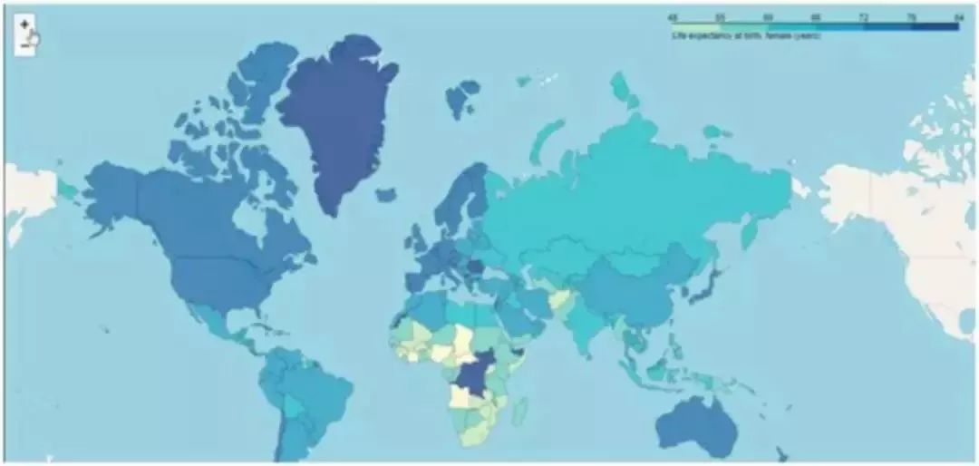 现在我们有了地图。首先,颜色越暗代表女性的预期寿命更长。显然,美国和大多数欧洲女性的预期寿命较长。