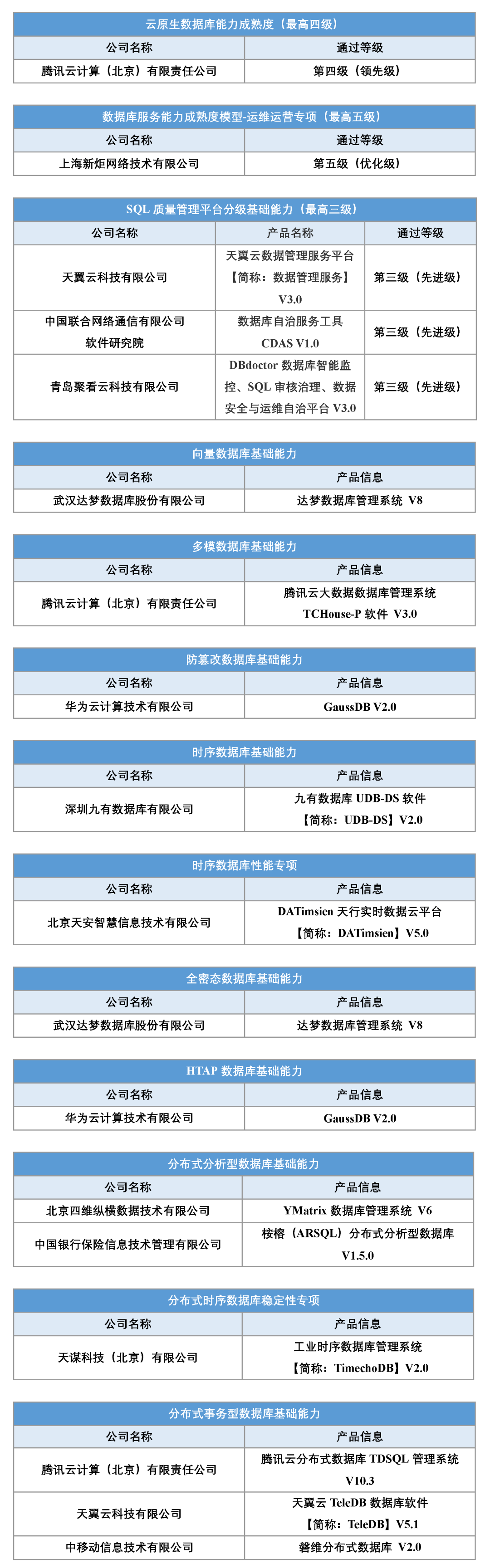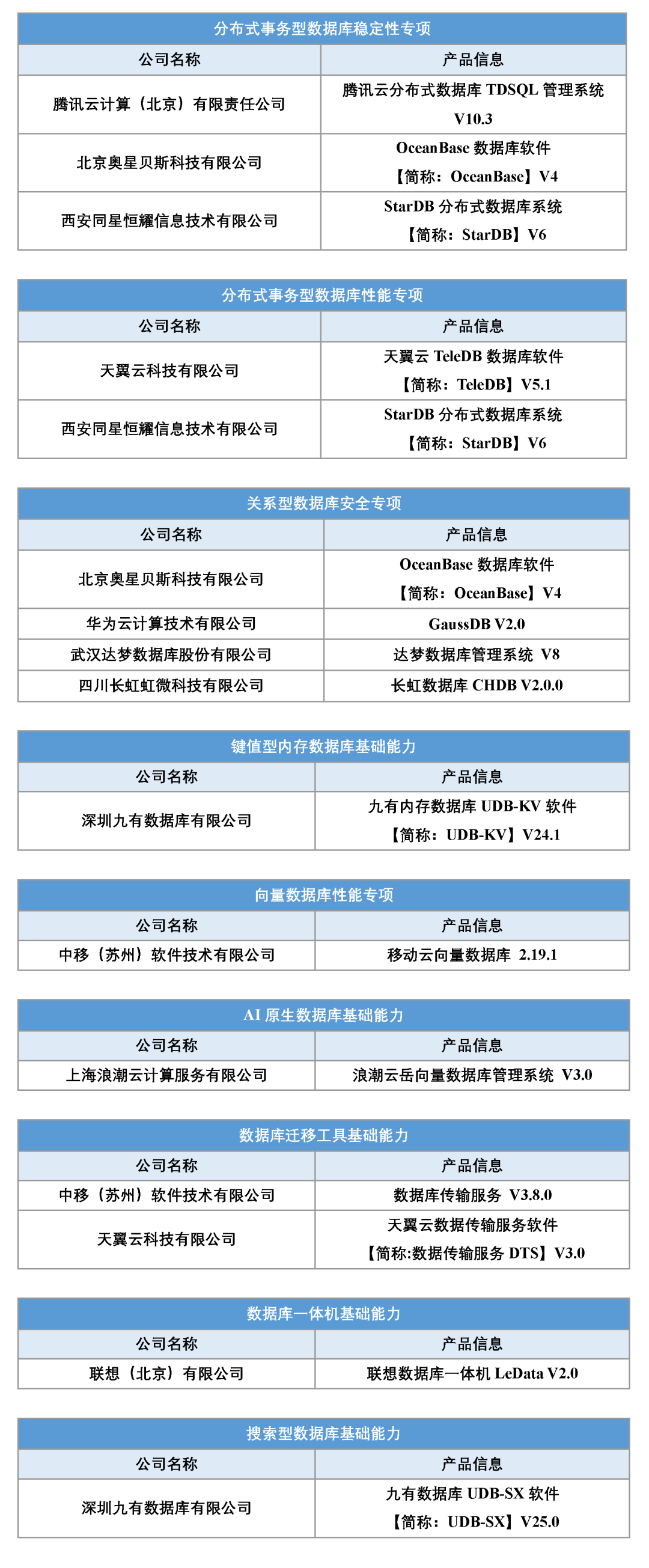 本次通过云原生数据库能力成熟度评估的包括1款云原生数据库产品;通过数据库服务能力成熟度模型-运维运营专项测试的包括1家数据库服务提供方;通过SQL质量管理平台分级基础能力测试的包括3款产品;通过基础能力测试的包括1款向量数据库、1款多模数据库、1款防篡改数据库、1款搜索型数据库、1款时序数据库、1款全密态数据库、1款事务分析混合型(HTAP)数据库、1款键值型内存数据库、1款AI原生数据库、2款分布式分析型数据库、3款分布式事务型数据库、2款数据库迁移工具和1款数据库一体机;通过关系型数据库安全专项测试的包括4款关系型数据库;通过性能专项测试的包括1款时序数据库、1款向量数据库和2款分布式事务型数据库;通过稳定性专项测试的包括1款分布式时序数据库和3款分布式事务型数据库。