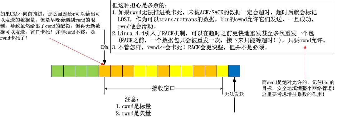 在第1点中,我描述了bbr确实忽略了Recovery等非Open的拥塞状态,但是为什么可以忽略呢?一般而言,很多人都会质疑,会说bbr采用这么鲁莽的方式,最终一定会让窗口卡住不再滑动,但是我要反驳,你难道不知道cwnd只是个标量吗?我画一个图来分析:
