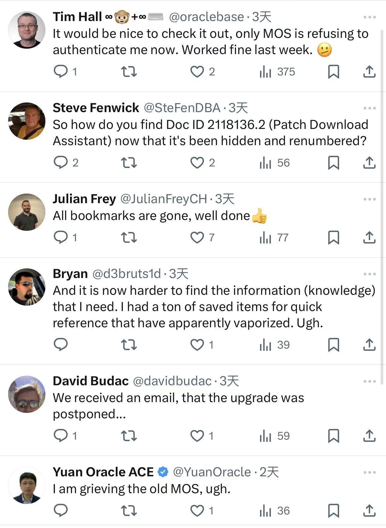 当天我也写了一篇吐槽的文章:Oracle MOS 重磅升级?嗯,什么东西!,转头来看,其实大家最不爽的就是以前保存的很多经典的 MOS 文档都找不到了。