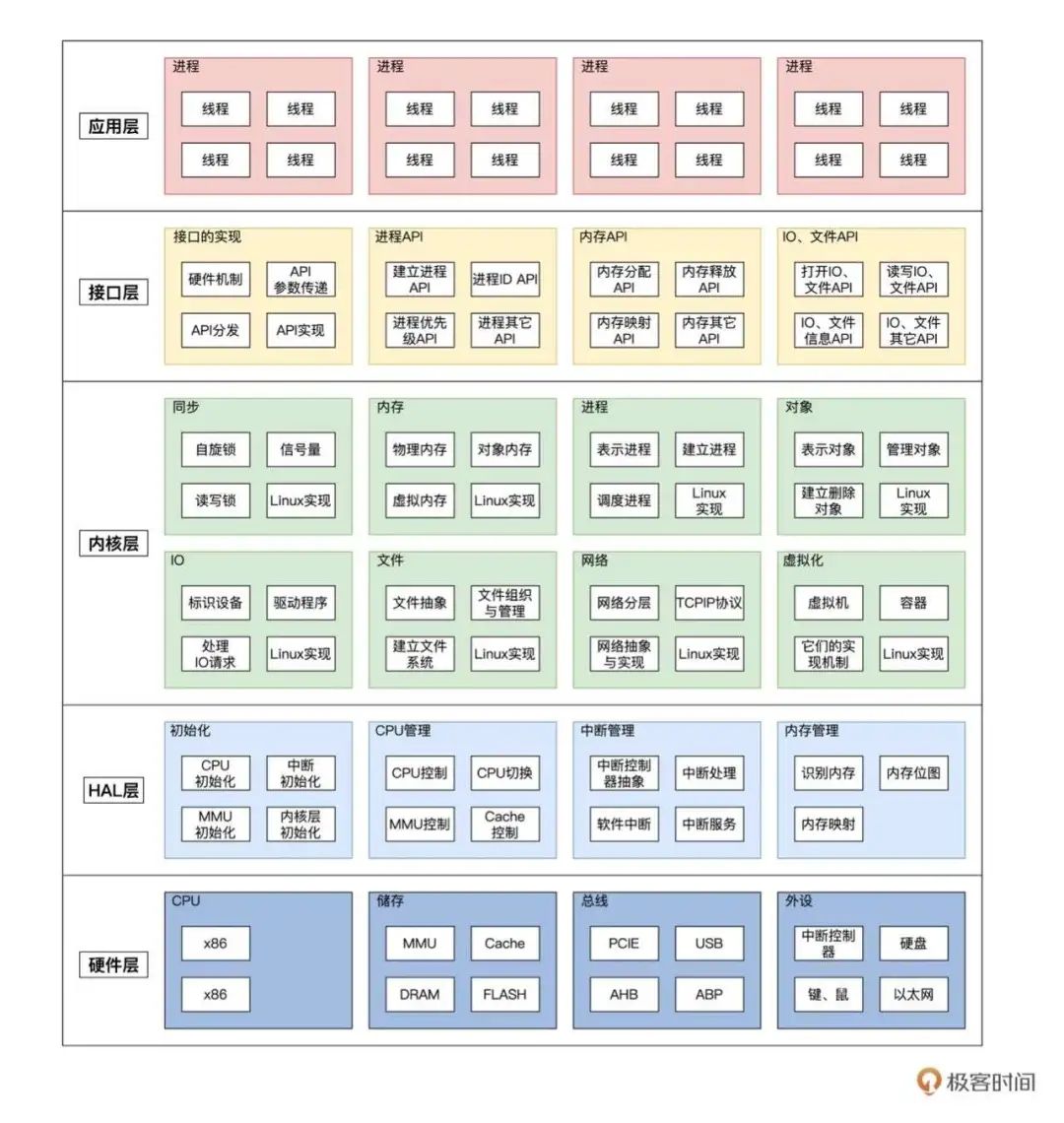 学好了,内存泄漏、服务进程 dang 掉、文件打不开等乱七八糟的问题都不再是问题,个人上升也会有更多的机会,因为你可以解决别人解决不了的问题,就是牛逼!学不好,那就被各种问题折磨,甚至35岁还得面临被淘汰的风险。所以我一直建议,趁着还学得动,多花点时间研究 OS 这些底层知识,这就是你的牛逼之处,也决定了你在这个行业可以走多远!学懂了这些基本功,再去琢磨那些被“追捧”的流行技术啊、demo 啊,都能轻松地理解背后高级的设计,理解系统中的性能瓶颈。就像“计算机鬼才”彭东所说:"生活可以一地鸡毛,但操作系统却是心中的光"。说起东哥,他在操作系统上的成就,让我颇为佩服,被称为“计算机鬼才”,是有原因的。非科班出身,却凭借惊人的意志与热爱,自学微机原理,编程语言,数据结构与算法,翻遍了操作系统和硬件书籍,独立开发了 x86 平台下的 LMOS 和 arm 平台下的 LMOSEM 两个操作系统。LMOS 现在已经发布 8 个测试版本,是多进程、多线程、多 CPU、支持虚拟内存的全 64 位操作系统内核,代码量足足有 10 万多行。如此浩大的项目,没点“程序员的浪漫”精神,想必很难坚持下来。他的书《深度探索嵌入式操作系统:从零开始设计、架构和开发》也曾给了我很多启发。数十年深入研究操作系统,他对 Linux、BSD、SunOS 等开源操作系统,以及 Windows 的 NT 内核都非常熟悉,在编译器,数据库等基础架构方面也颇有研究。可以说,在操作系统领域,他是当之无愧的 KOL,非常有发言权。这条路上,会有哪些难点和阻碍,会踩哪些坑,他都了如指掌。所以,当我听说彭东在极客时间写了一个《操作系统实战45讲》专栏,非常意外,第一时间就订阅了。让我很惊喜的是,彭东把“学操作系统不要死看书”的主张贯穿到专栏里,通过配套实验带你完成一个 OS,当你真的动手写了一个 OS 的时候,对操作系统的理解会是质的飞跃。下图是彭东梳理的「简化版操作系统知识体系」,图中的每一小块,都会随着课程的进行,逐一展开,建议先马后看。他会带你从 0 到 1,一步步实现一个基于 x86 平台的 64 位多进程的操作系统—— Cosmos,你将拥有一个属于自己的操作系统内核,对 Linux 内核的理解也会更加透彻。跟着学下来,操作系统架构设计能力会大幅提升,还可以学到系统级别的软件编程技巧,这对我们拓展技术深度和广度是大有裨益的。最重要的是,求职面试也会成为加分项,自己动手写过操作系统,真有“飘”的资本,简历自然脱颖而出。