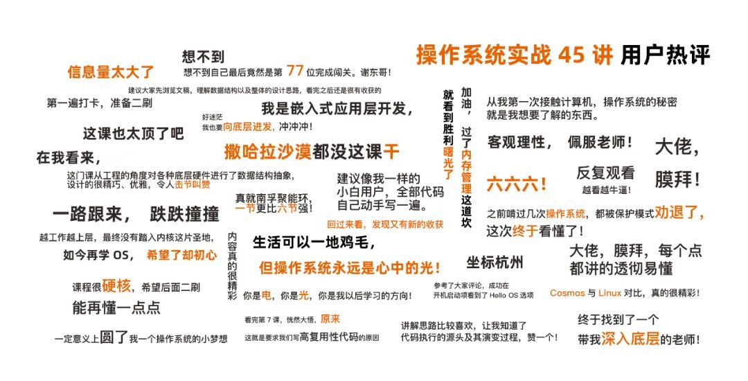 这门课程上线两个月,订阅量就已经超 10000 订阅了,这个结果其实并不意外,毕竟,业界大牛手把手带着写 OS 的机会实在太难得。我在追更的同时,也不禁佩服,彭东海量的知识储备和极佳的表达能力。要知道,越是底层的知识越不好讲透:要用通俗易懂的语言,把复杂的操作系统“讲”出来;要注意细节与重点的把握和梳理;要把复杂的内容,交付给各个不同思想层次,不同思维方式的人。前两天,编辑在后台筛选留言做个了好评图,大家可以看看