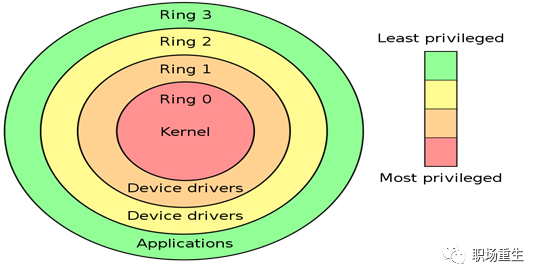 Linux 按照特权等级,把进程的运行空间分为内核空间和用户空间,分别对应着下图中, CPU 特权等级的 Ring 0 和 Ring 3。