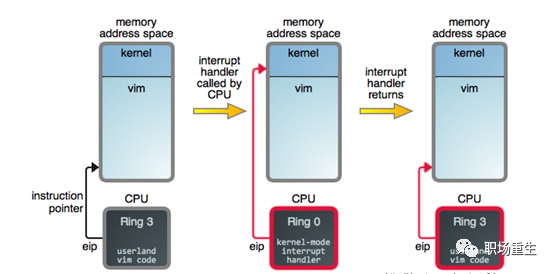 用户空间(Ring 3)只能访问受限资源,不能直接访问内存等硬件设备,必须通过系统调用陷入到内核中,才能访问这些特权资源;