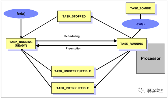 只有在该状态的进程才可能在CPU上运行。而同一时刻可能有多个进程处于可执行状态,这些进程的task_struct结构(进程控制块)被放入对 应CPU的可执行队列中(一个task最多只能出现在一个CPU的可执行队列中)。进程调度器的任务就是从各个CPU的可执行队列中分别选择一个task在该 CPU上运行。很多操作系统教科书将正在CPU上执行的进程定义为RUNNING状态,而将可执行但是尚未被调度执行的进程定义为READY状态,这两种状态在linux下统一为 TASK_RUNNING状态。