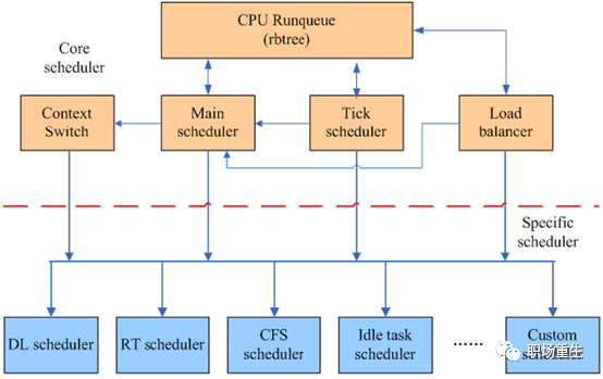 Linux调度器采用了模块化设计的思想,从而把进程调度的软件分成了两个层次,一个是core scheduler layer,另外一个是specific scheduler layer: