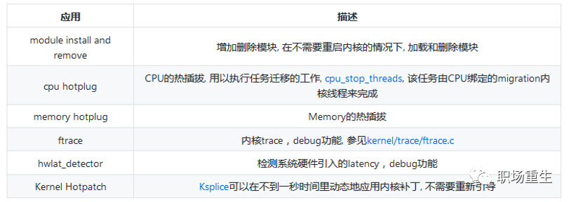 stop_sched_class用于停止CPU, 一般在SMP系统上使用, 用以实现负载平衡和CPU热插拔. 这个类有最高的调度优先级,stop调度器类实现了Unix的stop_machine 特性, stop_machine 是一个通信信号 : 在SMP的情况下相当于暂时停止其他的CPU的运行, 它让一个 CPU 继续运行,而让所有其他CPU空闲。在单CPU的情况下这个东西就相当于关中断。一般来说,内核会在如下情况下使用stop_machine技术:
