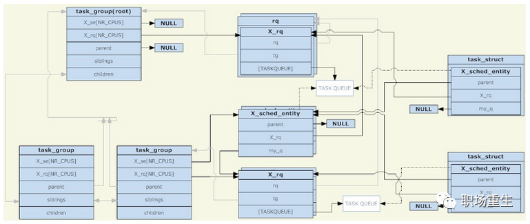 在linux内核中,使用task_group结构来管理组调度的组。所有存在的task_group组成一个树型结构(与cgroup的目录结构相对应),task_group可以包含具有任意调度类别的进程(具体来说是实时进程和普通进程两种类别),于是task_group需要为每一种调度策略提供一组调度结构。这里所说的一组调度结构主要包括两个部分,调度实体和运行队列(两者都是每CPU一份的)。调度实体会被添加到运行队列中,对于一个task_group,它的调度实体会被添加到其父task_group的运行队列,因为被调度的对象有task_group和task两种,所以需要一个抽象的结构来代表它们。如果调度实体代表task_group,则它的my_q字段指向这个调度组对应的运行队列;否则my_q字段为NULL,调度实体代表task。在调度实体中与my_q相对的是X_rq(具体是针对普通进程的cfs_rq和针对实时进程的rt_rq),前者指向这个组自己的运行队列,里面会放入它的子节点;后者指向这个组的父节点的运行队列,也就是这个调度实体应该被放入的运行队列;