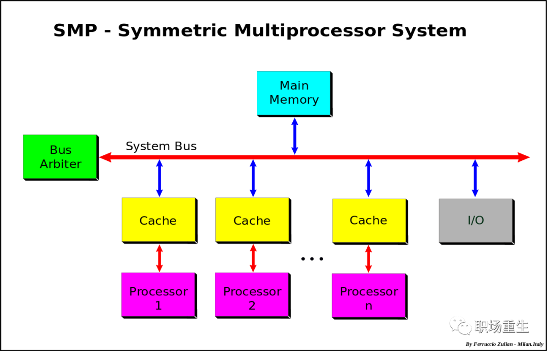 SMP (Symmetric Multiprocessing),对称多处理器. 顾名思义, 在SMP中所有的处理器都是对等的, 它们通过总线连接共享同一块物理内存,这也就导致了系统中所有资源(CPU、内存、I/O等)都是共享的,其架构简单,但是拓展性能比较差。