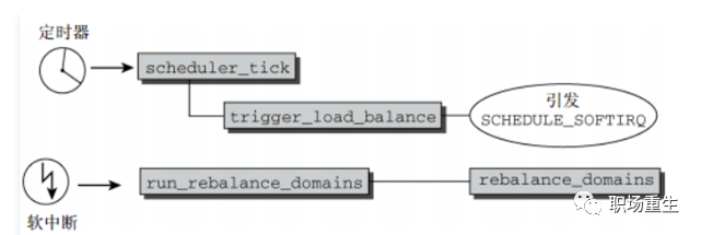 SCHEDULE_SOFTIRQ软中断softIRQ,该中断确保会在适当的时机执行run_rebalance_domains。该函数最终对当前CPU调用rebalance_domains,实现负载均衡。