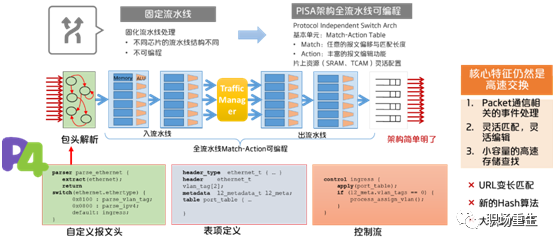 p4 为一种高级可编程协议无关处理语言,结合可编程交换机芯片,编程能力强,可以实现业务offload 到硬件,转发面 p4lang 定制开发,控制面可通过 Apache Thrift、gRPC 接口远程管理,生态繁荣包括P4 Runtime、Stratum;