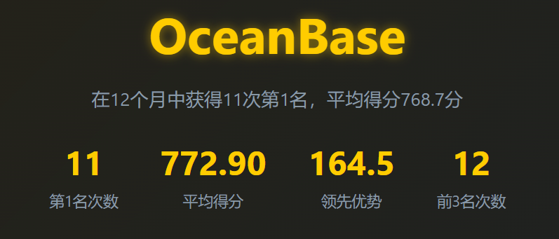 OceanBase以768.7的平均分高居榜首,比第二名PolarDB(604.2)高出164.5分,显示出巨大的领先优势。前十名数据库的平均分均超过300分,形成明显的第一梯队。