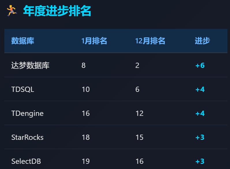 2025年度,12月份和1月份相比,达梦数据库、TDSQL、TDengine、StarRocks、SelectDB排名均有显著提升(仅分析进入年度平均分前20的数据库)。