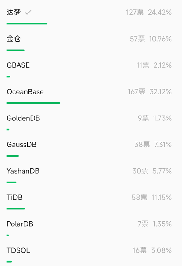 投票结果如下,前三名分别是:OceanBase、达梦、TiDB。