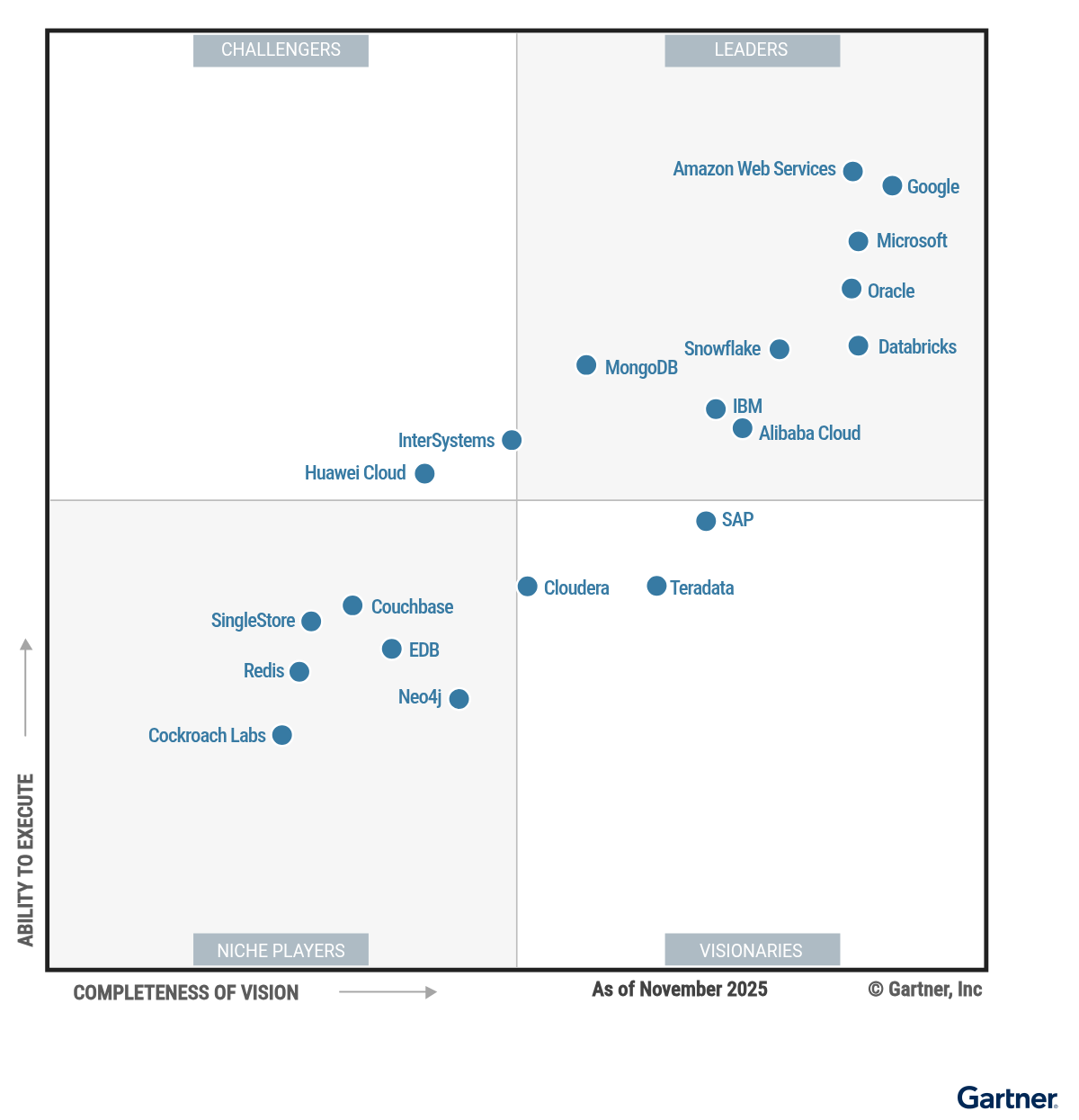 2025年11月18日,Gartner发布“2025 Gartner 云数据库管理系统魔力象限”。2025年Gartner云数据库管理系统(DBMS)魔力象限认可了包括Databricks(领导者)、谷歌云、AWS、IBM、微软和甲骨文等主要参与者为领导者,突出了它们在分析、人工智能集成和多样化云能力方面的优势。其中,Databricks因其数据智能平台而受到关注,谷歌则因其Spanner和BigQuery而备受瞩目。此外,像Neo4j、Cockroach Labs和InterSystems等公司也作为被评估的供应商出现。中国两家数据库厂商入选该象限,阿里云入选“领导者”象限,华为云入选“挑战者”象限。