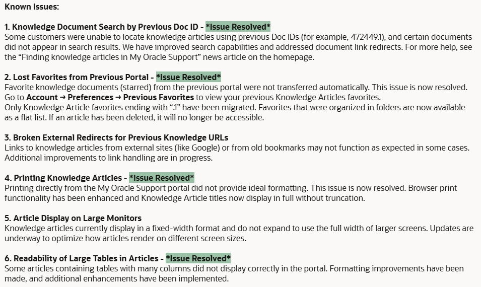 - 文档搜索功能修复:之前用户无法通过旧版文档编号(如 472449.1)搜索知识文章,且部分文档不显示,现已提升搜索能力并修复链接重定向。