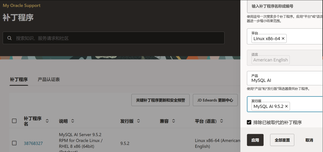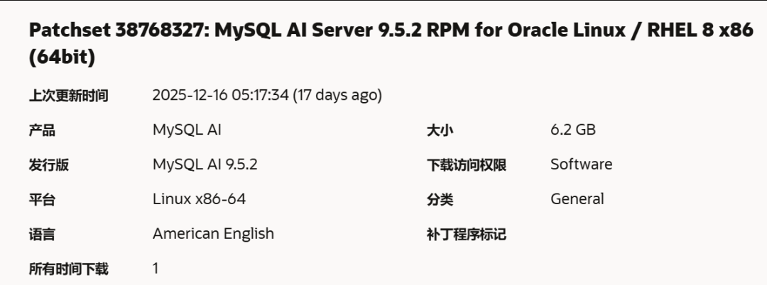 https://support.oracle.com/support/Patchset 38768327: MySQL AI Server 9.5.2 RPM for Oracle Linux / RHEL 8 x86 (64bit)--在补丁下载页面,选择平台 Linux x86-64 ,产品选择 MySQL AI ,发行版选择 MySQL AI 9.5.2 即可找到。P38768327_952_Linux-x86-64.ziphttps://edelivery.oracle.com/osdc/faces/Home.jspx