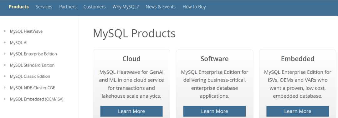 https://www.mysql.com/products/MySQL HeatWaveMySQL AIMySQL 企业版MySQL 标准版MySQL 经典版MySQL NDB 集群MySQL嵌入式(OEM/ISV)