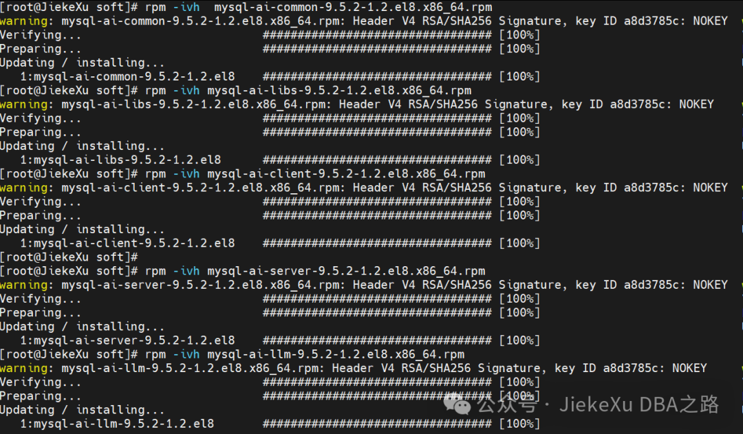 [root@JiekeXu soft]# rpm -ivh mysql-ai-llm-9.5.2-1.2.el8.x86_64.rpm