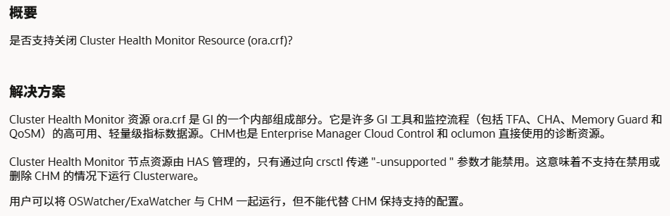 CHM 在 Oracle 集群中作为一个高可用性服务运行,其资源名为 ora.crf,由集群的 OHASD 守护进程统一管理。