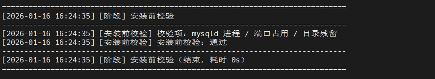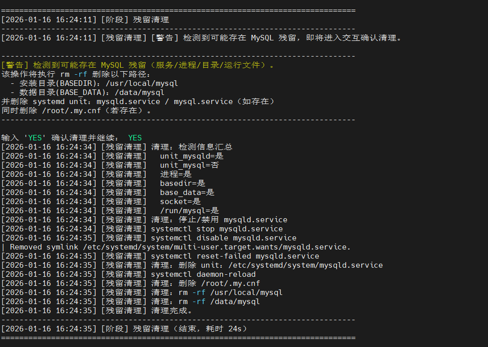 --baseline-only只执行系统基线,不安装 MySQL。 - 残留清理:发现 MySQL 残留则提示确认,确认后停止服务/杀进程/删除目录与 unit。