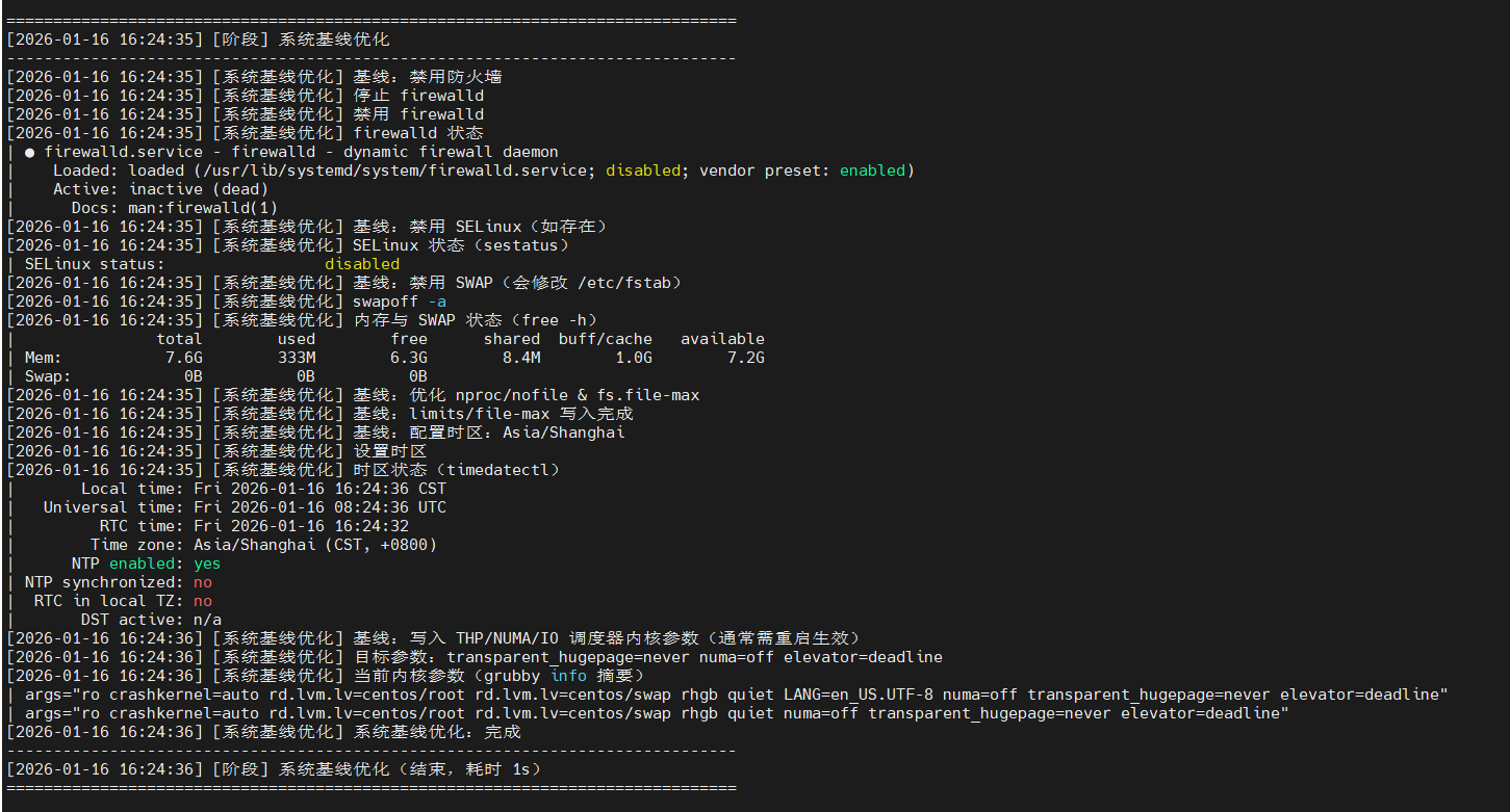 - 系统基线优化(默认执行):处理防火墙、SELinux、SWAP、时区、limits/file-max、GRUB 内核参数等。