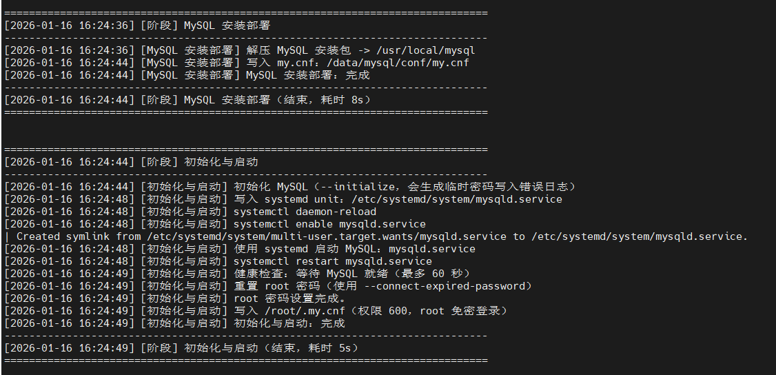 --initialize)、生成 systemd unit、启动服务并做健康检查。 - root 密码处理:从错误日志解析临时密码并重置为指定密码,同时生成