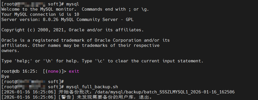 /root/.my.cnf方便免密登录。 - 自动备份:生成 mysqldump 每日全备脚本(排除系统库、按库拆分、压缩、校验、保留 7 天)并写入 root crontab 定时执行。