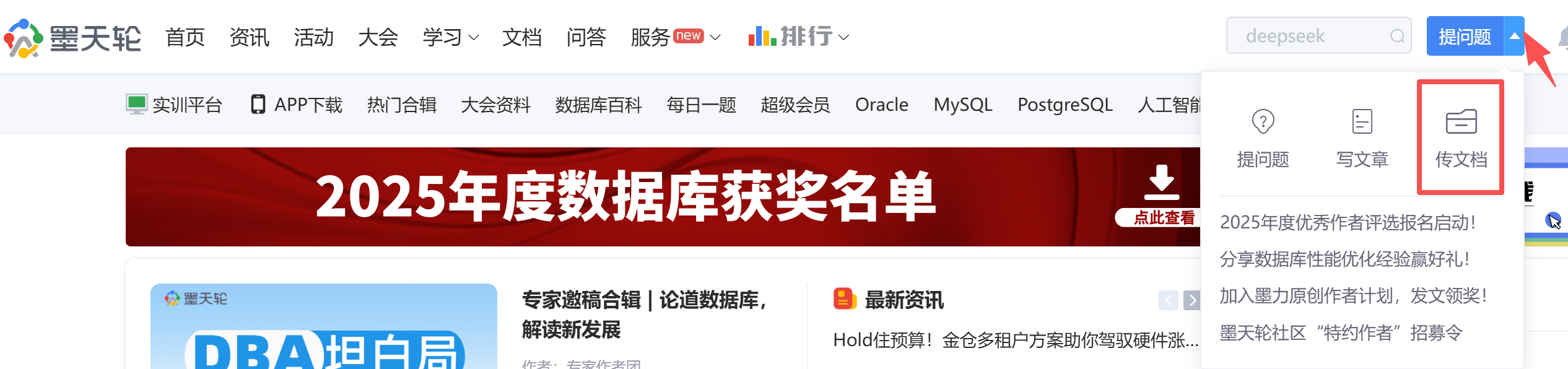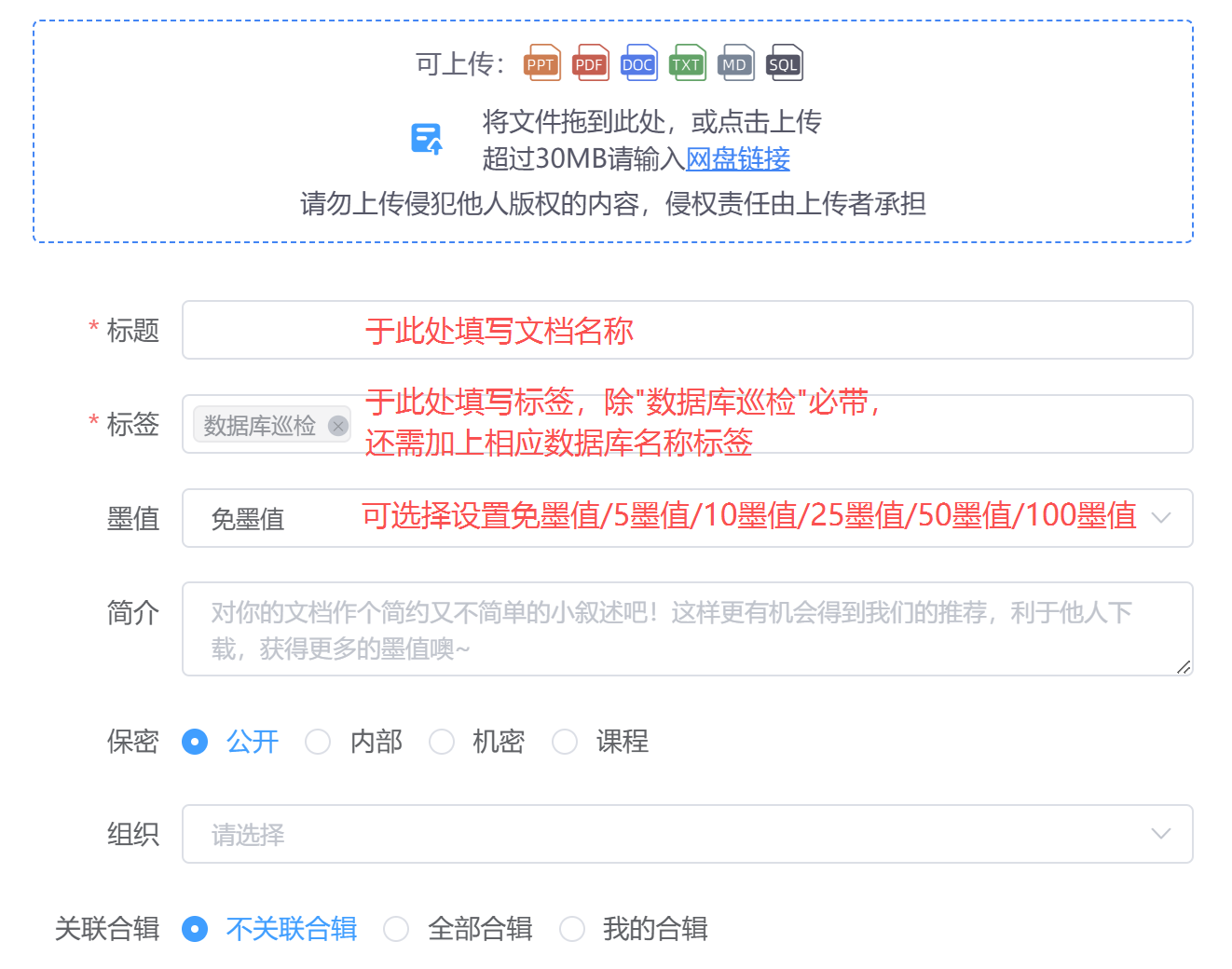 - 登录上传:登录墨天轮账号后,点击链接直达上传页:https://www.modb.pro/docUpload,或在首页下拉框点击 “传文档”;