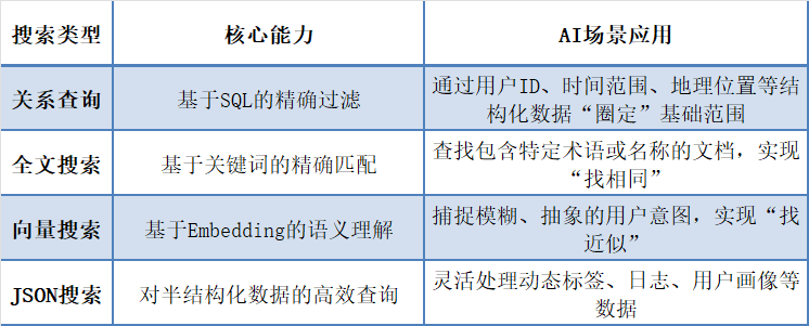 正如 OceanBase CTO 杨传辉所言,“向量搜索只是 AI 数据库的初级阶段,最终所有向量搜索都会演进为混合搜索——能否支持混合搜索,正是衡量 AI 数据库核心实力的关键分水岭”。