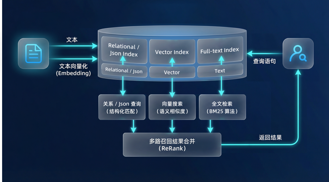 OceanBase 的混合搜索能力,正是为解决这类多维度信息综合检索的难题而生。它将四种关键的搜索能力无缝融合在一个查询引擎中: