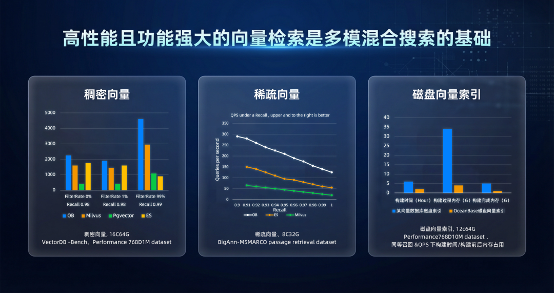 高性能且功能完备的向量搜索,是混合搜索的核心基础。目前,OceanBase 向量搜索性能已达到业界开源向量数据库的先进水平——无论是稠密向量还是稀疏向量,在向量数据库领域主流 Benchmark 测试中均表现突出。