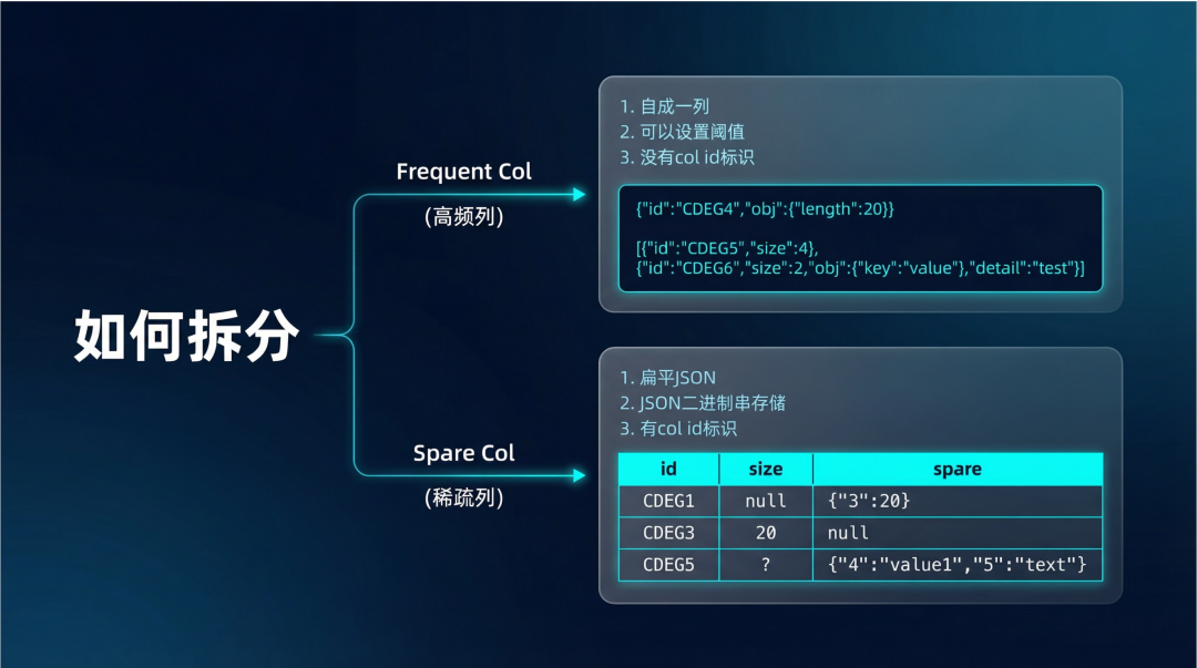 OceanBase 针对性地设计了创新的存储方案。它采用 JSON 二进制存储,并创造性地实现了“列化拆分”。通过智能识别“高频列(Frequent Col)”与“稀疏列(Spare Col)”,将频繁访问的字段独立成列存储,稀疏字段则聚合存储。