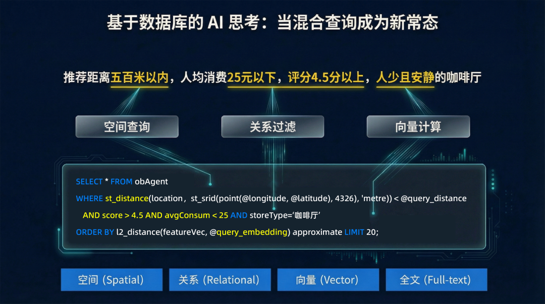 一个典型的复杂查询,如“推荐附近 500 米内,人均消费低于 25 元,评价超过 4.5 分,且环境安静的咖啡厅”,单纯的向量或文本搜索都难以胜任。这需要一个能同时理解并处理多种数据维度的“大脑”。