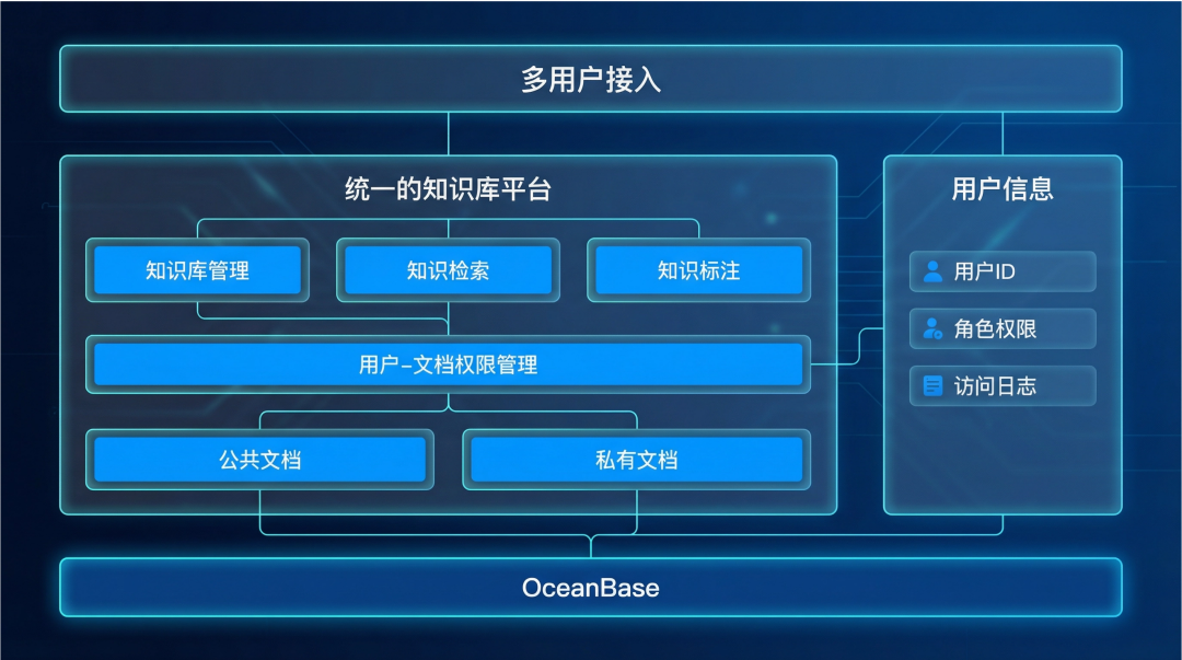 例如,在知识库场景中,需要管理用户权限、文档分类、访问日志等大量元数据,同时还要进行文档的语义检索。传统方案需要在应用层协调关系数据库与向量数据库的查询结果,而 OceanBase 则可以通过一条 SQL 完成“先通过关系过滤确定用户可访问的文档范围,再在该范围内进行向量语义搜索”的复杂操作,极大地简化了开发逻辑并提升了查询效率。
