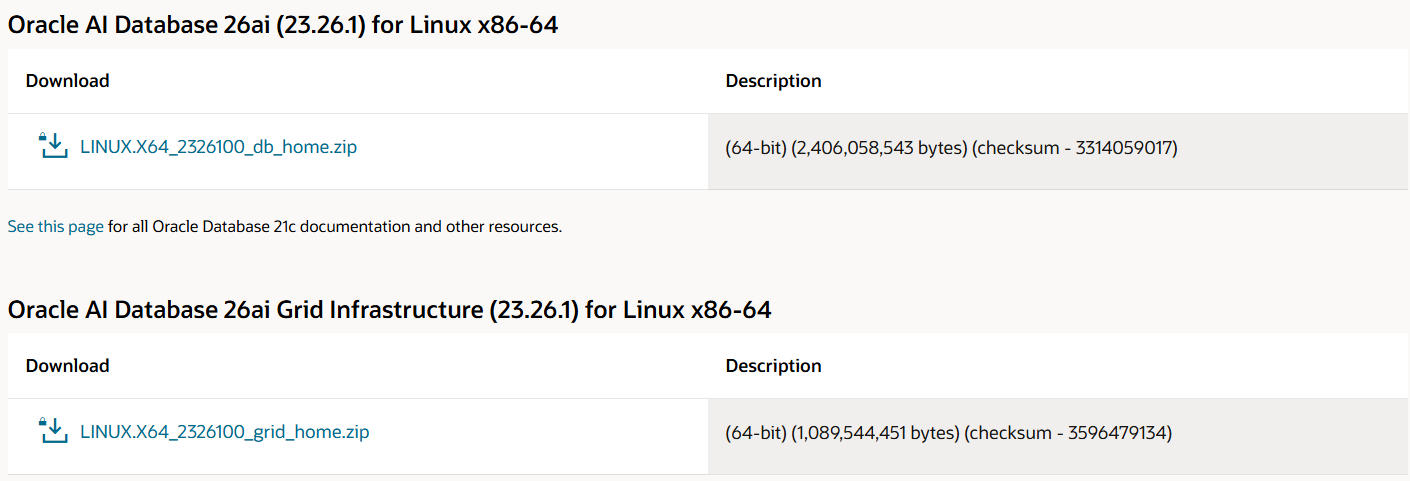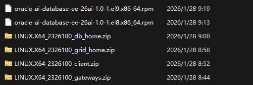 - 26ai 安装包下载:https://www.oracle.com/database/technologies/oracle26ai-linux-downloads.html