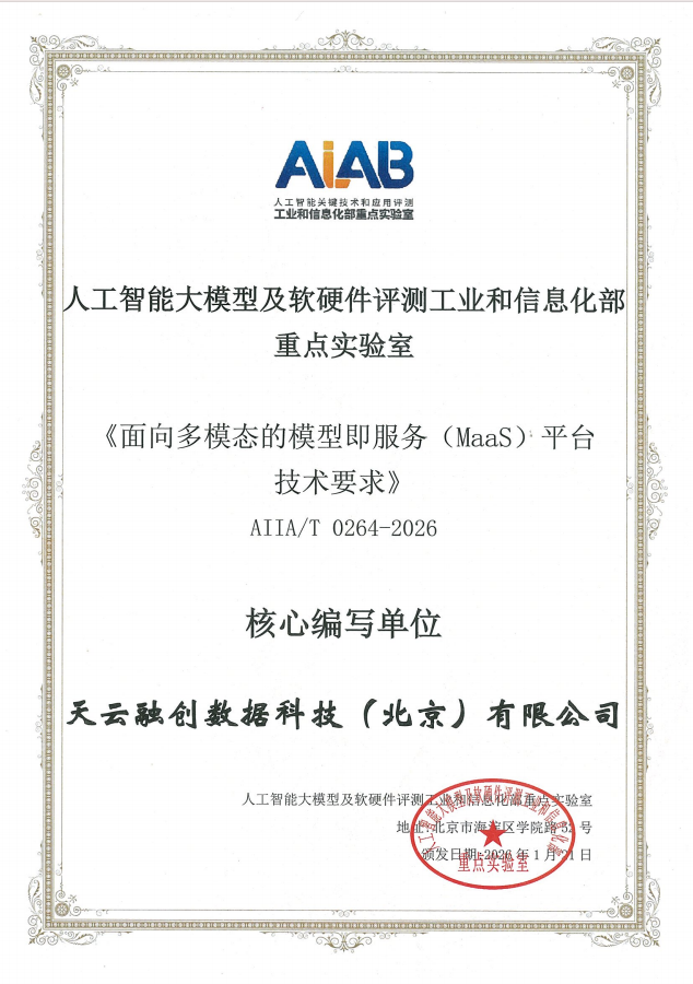 天云数据凭借在MaaS平台、多模态大模型及智能体网络领域的技术积淀与丰富实践,作为《面向多模态的模型即服务(MaaS)技术要求》的核心参编单位为标准制定提供支撑,助力AI模型服务化产业迈入规范化发展新阶段。