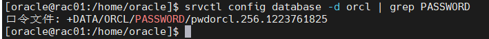 rac 的密码文件通常存放于 ASM 盘中,查看对应的密码文件位置: