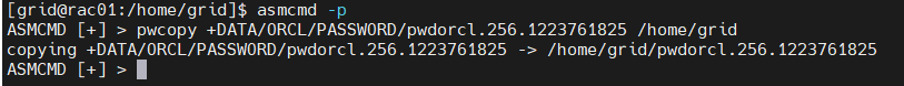 ASMCMD [+] > pwcopy +DATA/RPTDB/PASSWORD/pwdrptdb.256.1180304871 /home/grid/