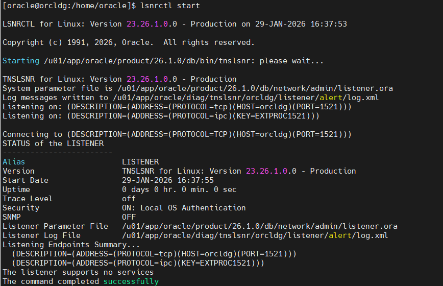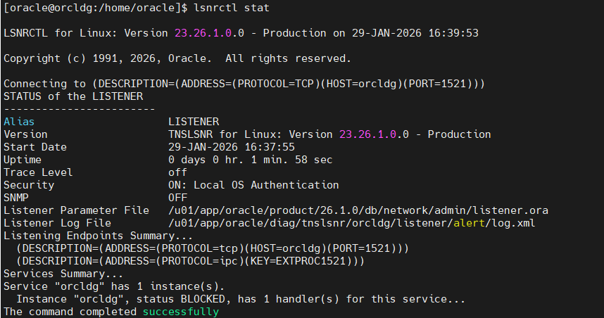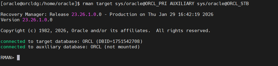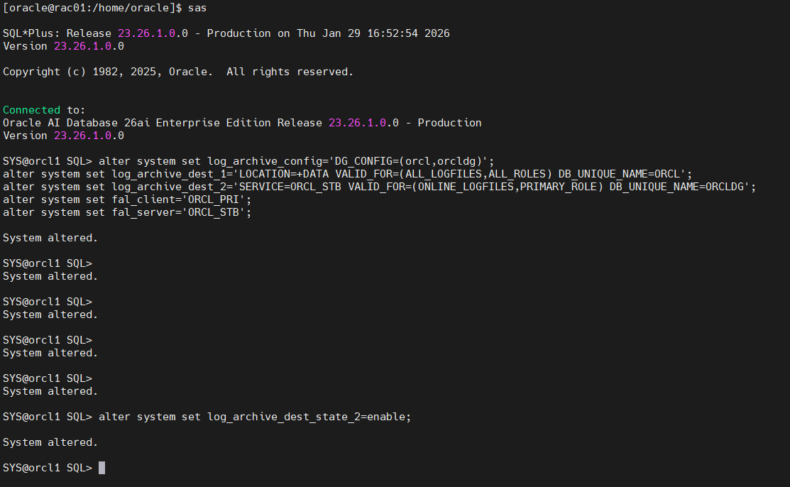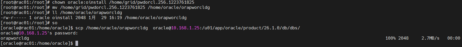 chown oracle:oinstall /home/grid/pwdorcl.256.1223761825 mv /home/grid/pwdorcl.256.1223761825 /home/oracle/orapworcldg scp /home/oracle/orapworcldg oracle@10.168.1.25:/u01/app/oracle/product/26.1.0/db/dbs/