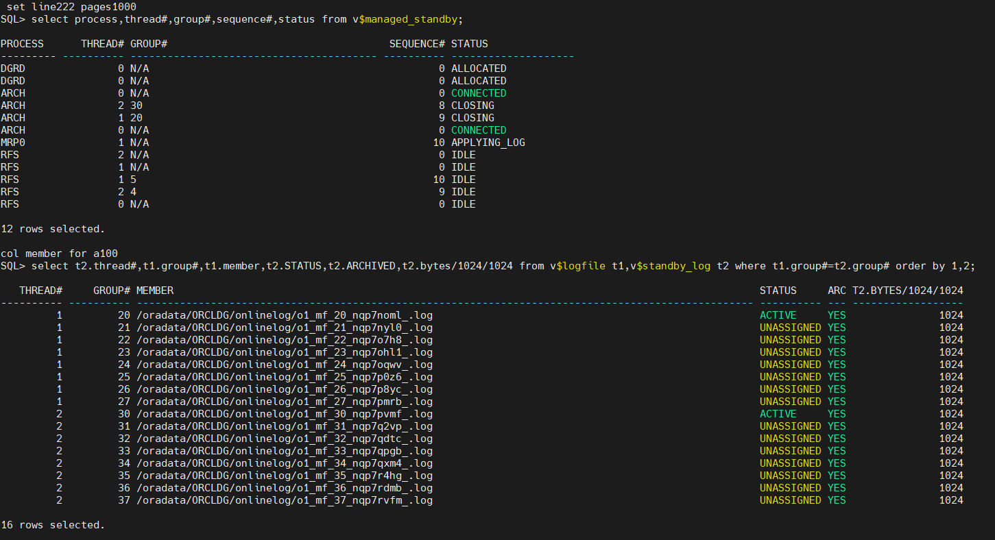 select t2.thread#,t1.group#,t1.member,t2.STATUS,t2.ARCHIVED,t2.bytes/1024/1024 from v$logfile t1,v$standby_log t2 where t1.group#=t2.group# order by 1,2;