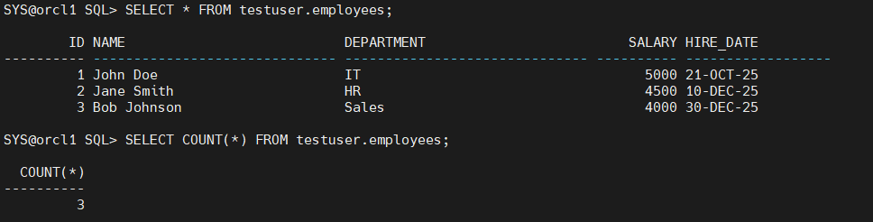 INSERT INTO testuser.employees VALUES (2, 'Jane Smith', 'HR', 4500, SYSDATE-50);