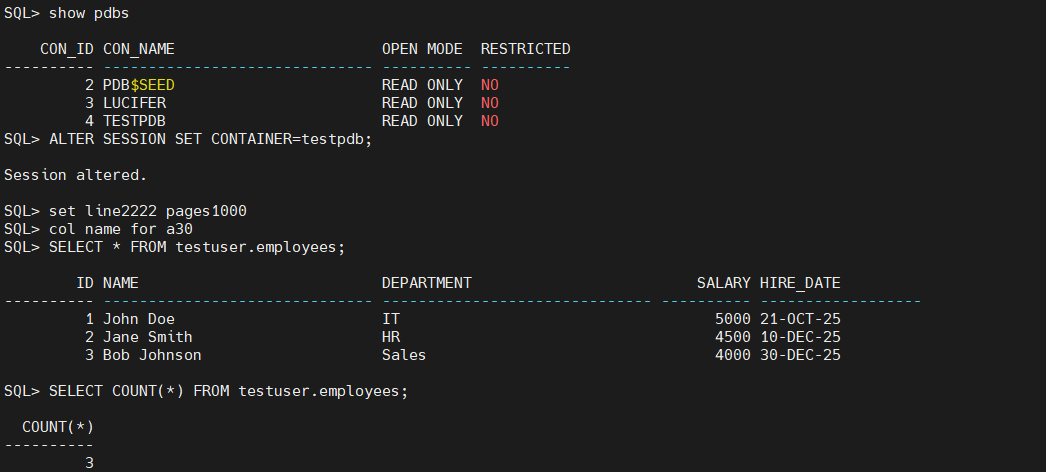 ALTER PLUGGABLE DATABASE testpdb OPEN;