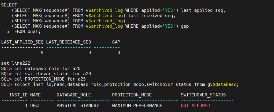 (SELECT MAX(sequence#) FROM v$archived_log WHERE applied='YES') last_applied_seq,