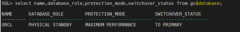 select name,database_role,protection_mode,switchover_status from gv$database;