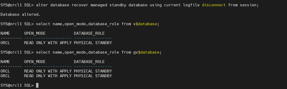 SQL> alter database recover managed standby database using current logfile disconnect from session;