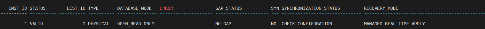 select inst_id,status,DEST_ID,TYPE,ERROR,GAP_STATUS,SYNCHRONIZED,SYNCHRONIZATION_STATUS,RECOVERY_MODE from GV$ARCHIVE_DEST_STATUS where STatus <> 'INACTIVE' and type = 'PHYSICAL';