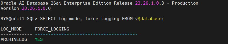 搭建 DataGuard 必须要开启归档模式和强制日志模式: